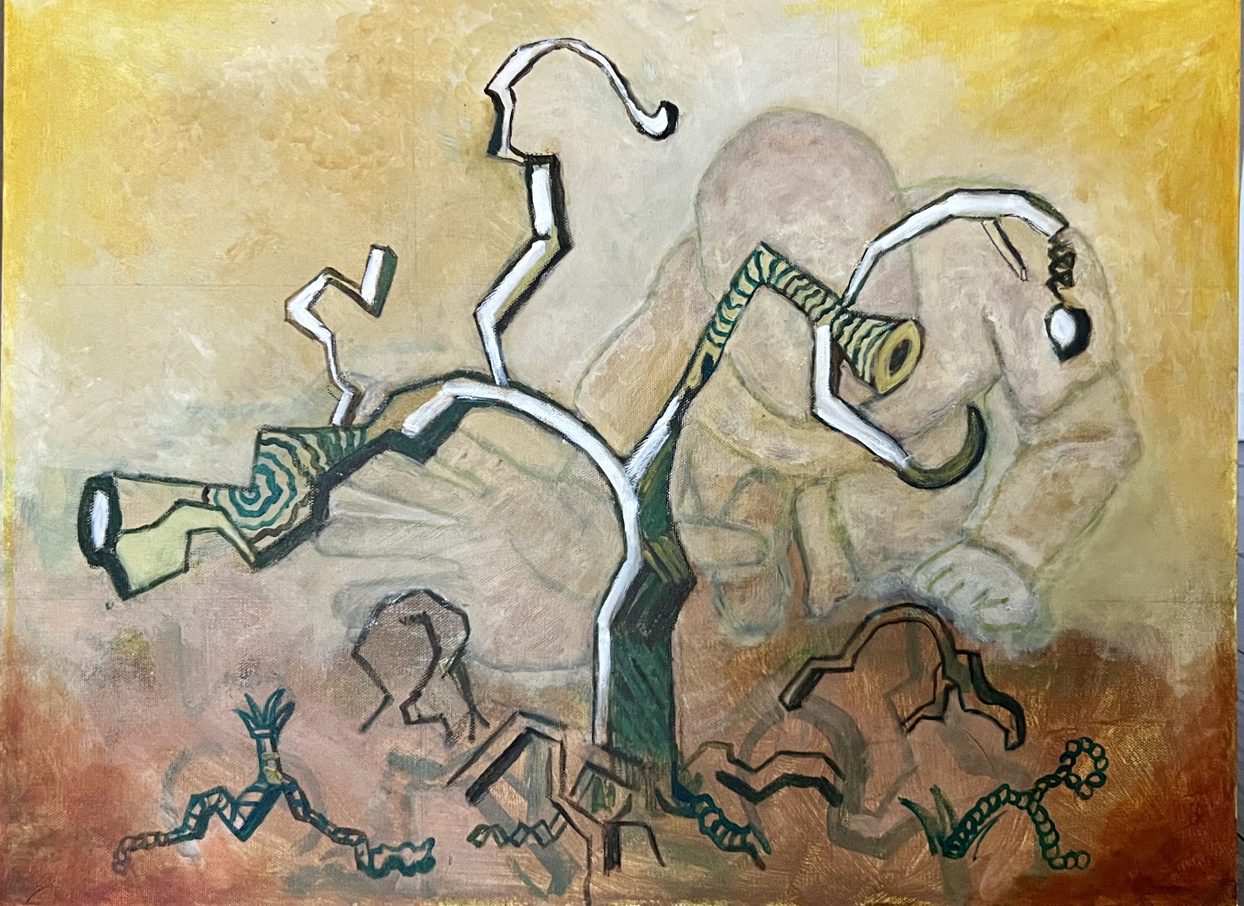 The composition is dominated by bold, twisting, root-like structures rendered in sharp, angular forms and accented with hypnotic line patterns. These organic yet mechanical shapes appear to emerge from a textured, earthy background of ochres and burnt siennas, evoking both the natural world and the subconscious mind. In the backdrop, ghostlike silhouettes of human figures seem to dissolve into the surface, creating an interplay between presence and absence, memory and erosion.