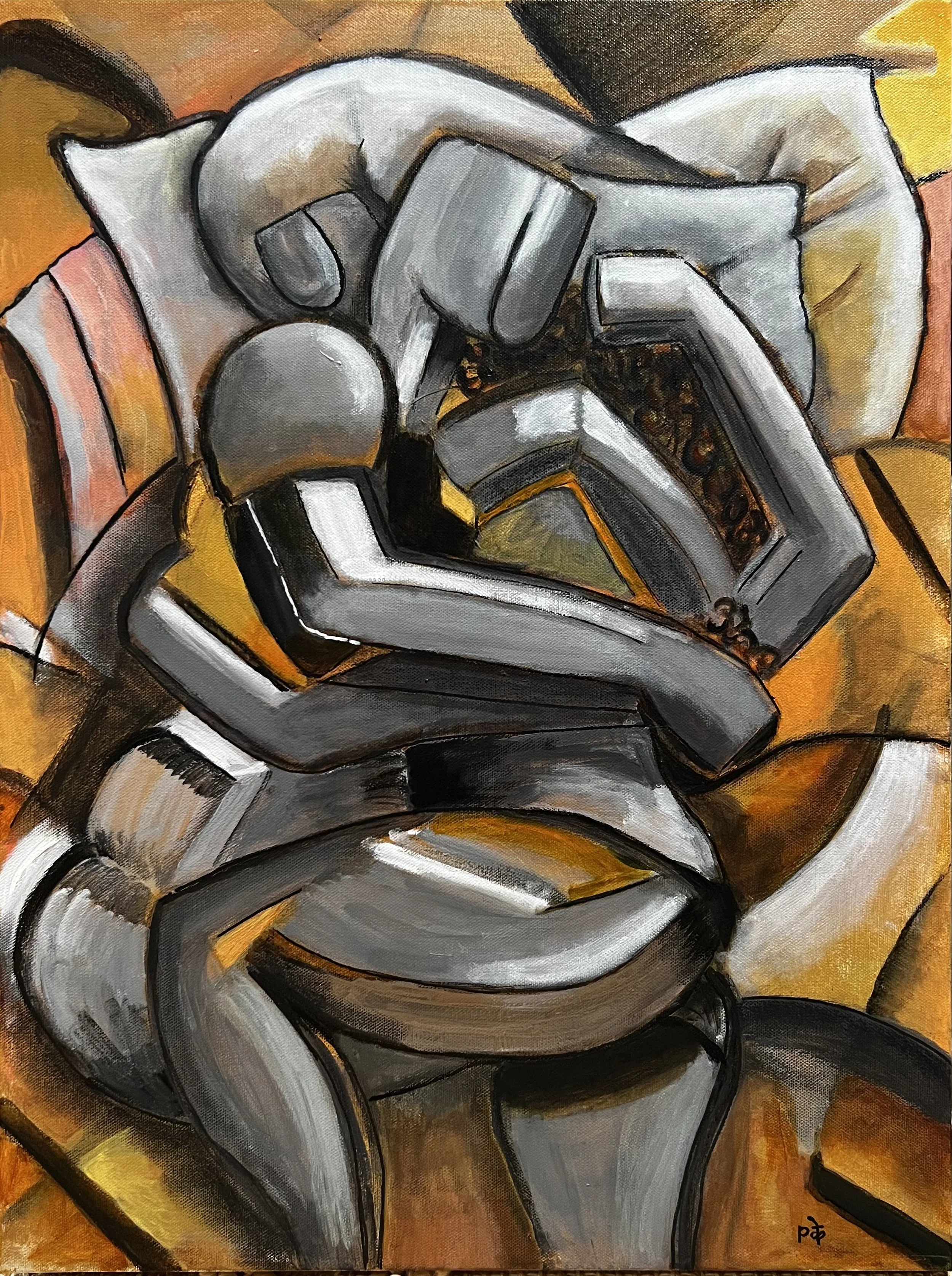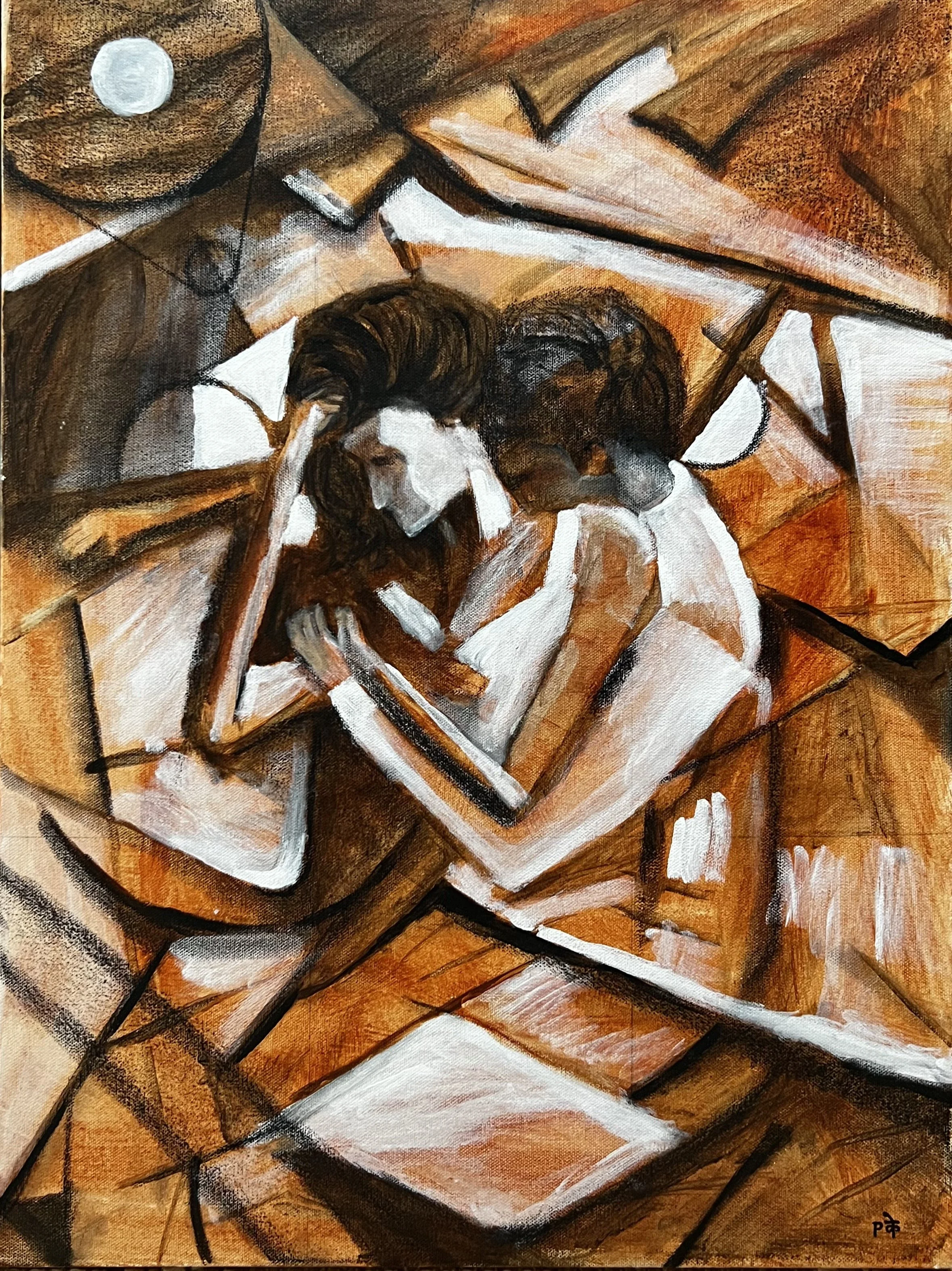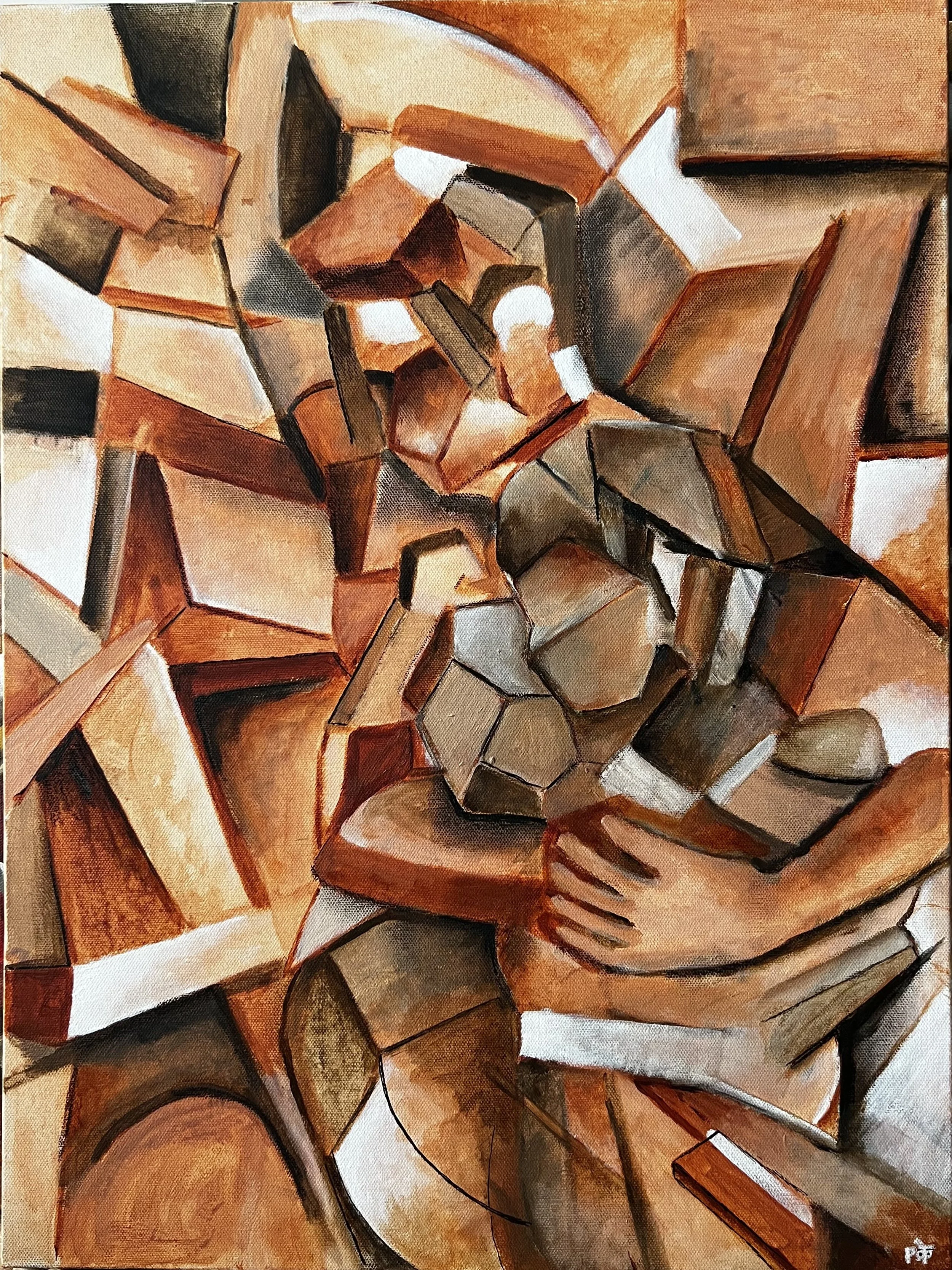 Embrace in Abstraction merges cubist structure with expressive figuration, using bold layers of ochre, sienna, and shadowed greys to build a composition that reveals new depth with each viewing.