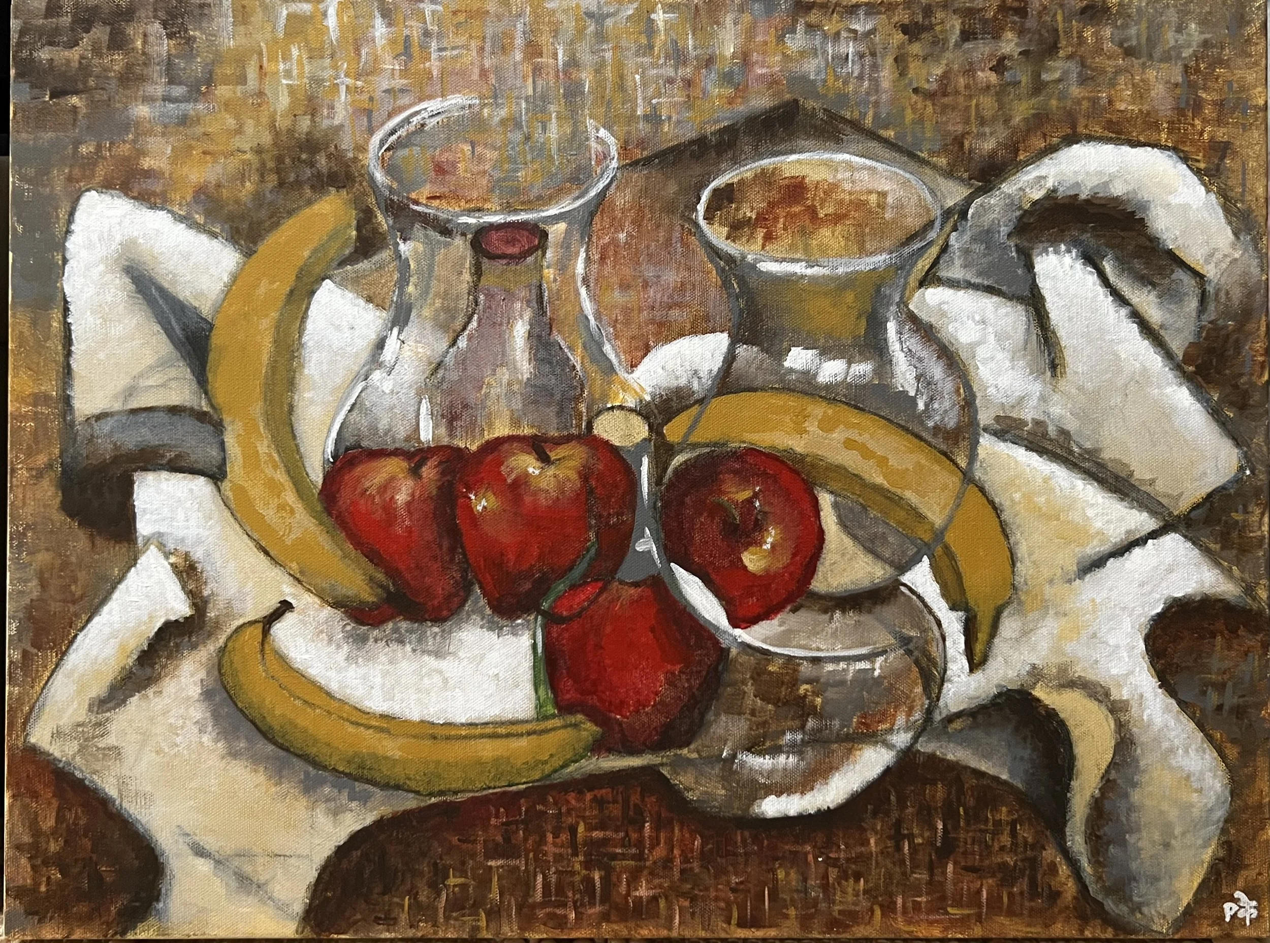 Symphony in Still Life, masterfully redefines the timeless tradition of the still life through a modernist lens. With bold contours, dynamic forms, and a harmonious palette of rich reds, golden yellows, and earthy browns, the piece transforms ordinary subjects—bananas, apples, vessels, and drapery—into an orchestrated visual poem.