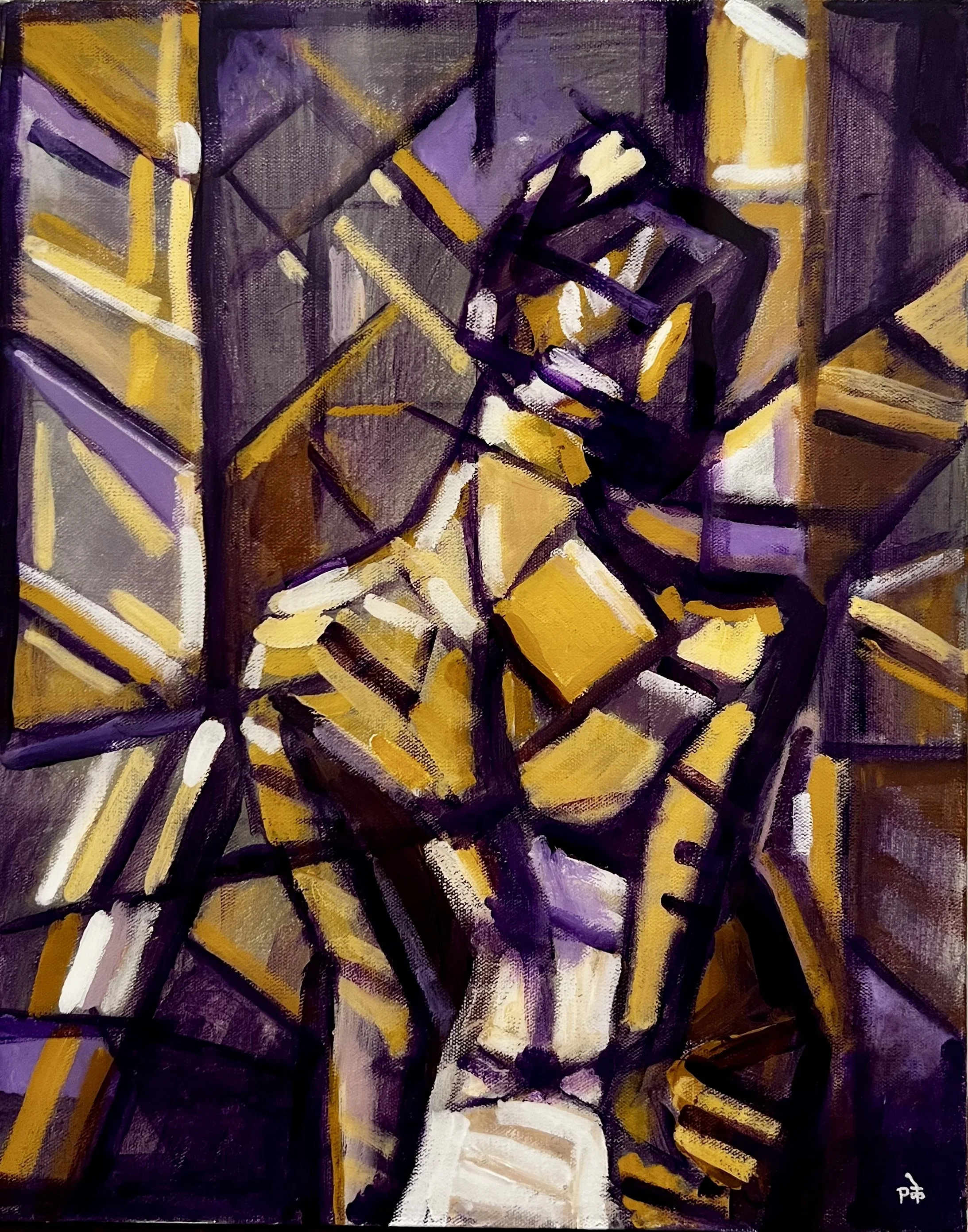 This one-of-a-kind painting captures the human form through a bold interplay of geometry, abstraction, and emotion. The figure emerges from a mosaic of angular planes in golden yellows, deep purples, and soft whites—each fragment both concealing and revealing, creating a rhythm of tension and harmony. The fractured composition invites the viewer to see beyond the surface, to piece together presence from abstraction, and to find beauty in the spaces between.