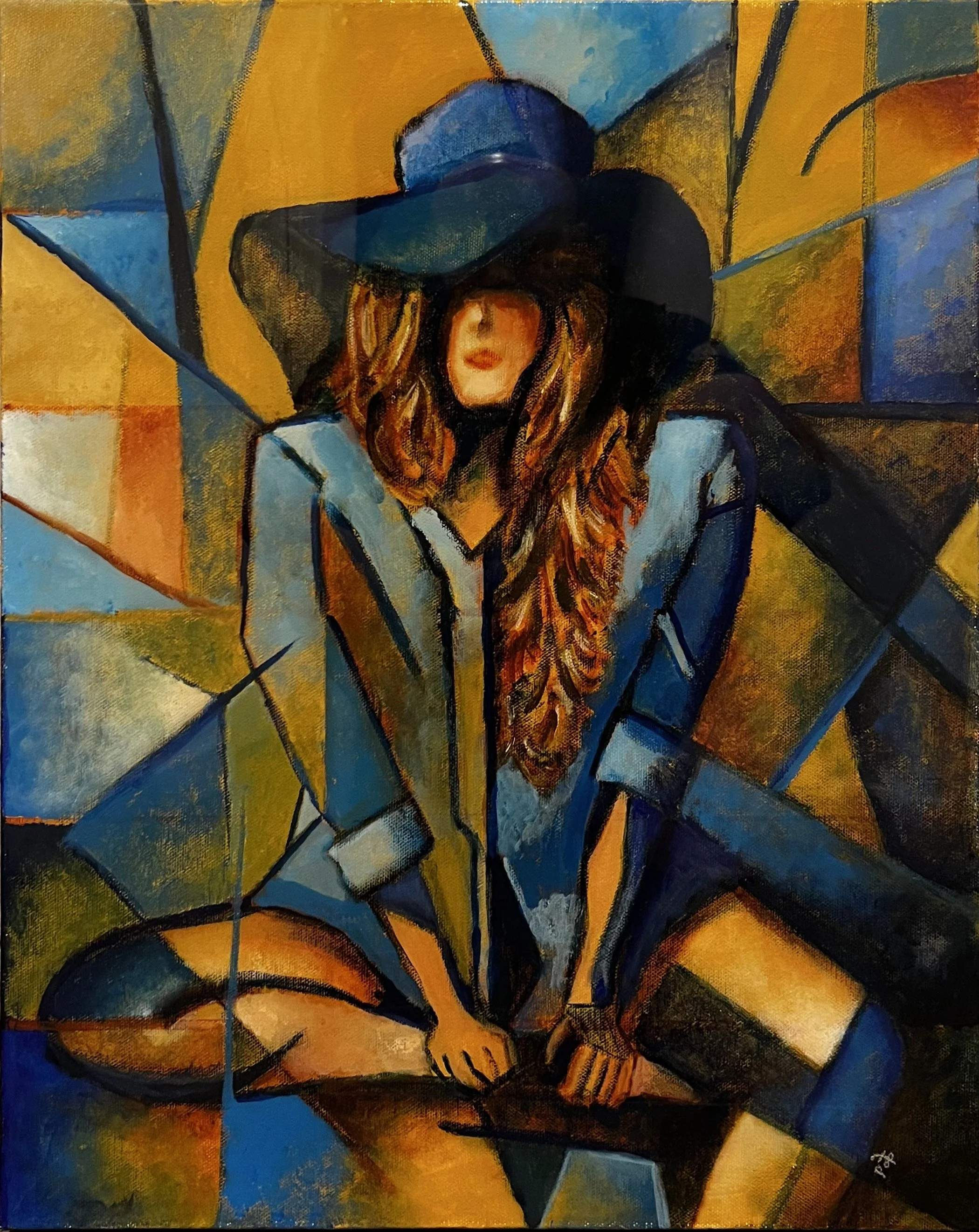 Silent Serenity is a captivating and unique painting that merges cubist influences with contemporary expression. The composition presents a mysterious seated figure, partially obscured beneath a wide-brimmed hat. Angular planes of color—rich in ochres, deep blues, and golden tones—fracture and reconstruct the image, creating a rhythmic geometry that suggests both strength and vulnerability. The woman’s downward gaze and hidden features heighten the sense of intrigue, while the flowing, textured treatment of her hair softens the angular composition.